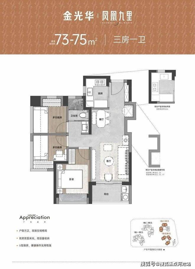 金光华凤凰九里开盘时间为2023年11月,推出1栋1/3单元,共430套房源,面积68-106㎡,2-4房,备案价单价3.72万-4.9万/㎡,开盘折扣为:备案价*88折,折后价格3.2万/㎡起。金光华凤凰九里得房率达到79%,加上赠送面积约88%,使用率对比现在新规建设后的对比还是比较一般。