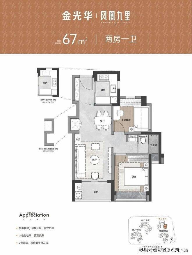 竖厅格局,S墙设计预留冰箱位,双次卧双面采光,U型厨房,卫生间三段式分离设计,有西南朝向及东南朝向。
