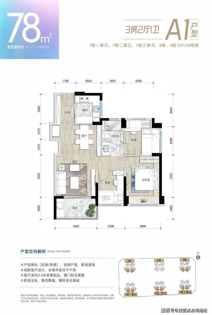 A1户型:3房2厅1卫(78㎡)