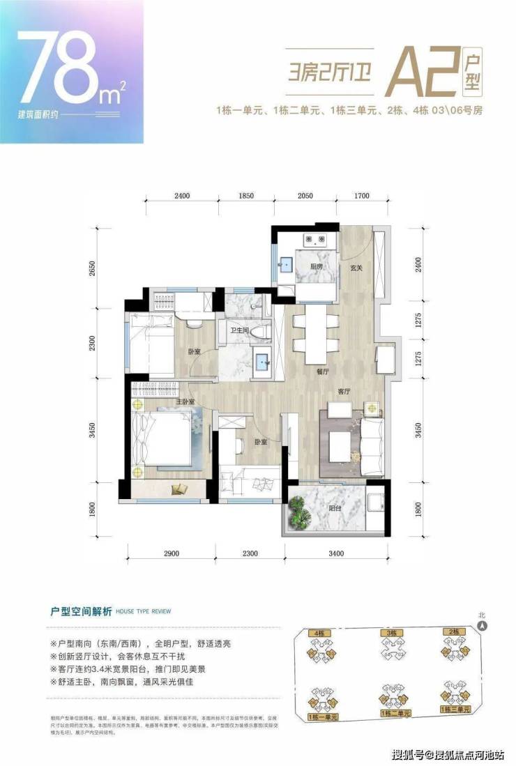 A2户型:3房2厅1卫(78㎡)