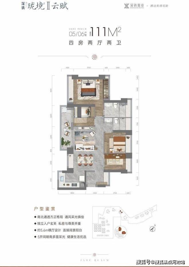 111㎡的4房2厅2卫,设计的是横厅南北通透格局,进门入户玄关,客餐厅5.6米开间,LDKB一体化设计,五开间朝南,客厅连接次卧出6.15米长的大阳台,U型厨房,卫生间干湿分离,得房率约75.4%(不含赠送),阳台主朝东南或西南向,其中西南朝向可以看阳台山景。