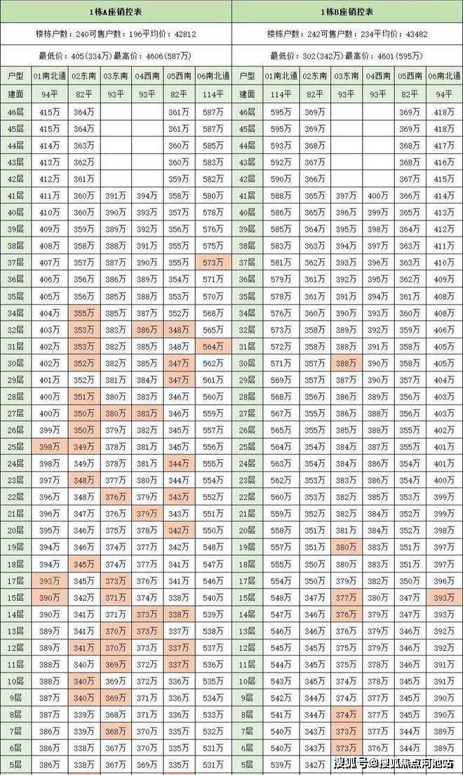 本项目共推出1栋A/B座482套房源,面积有82㎡的3房1卫,93-94㎡的3房2卫,114㎡的4房2卫户型,备案均价4.32/㎡,备案单价3.93-5.19万/㎡,总价334-596万/套,交楼时间是2025年9月30日前带简装修。