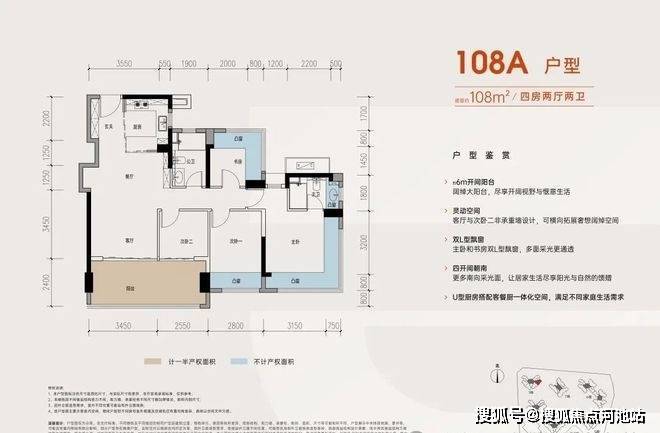 108㎡的4房2厅2卫,A户型,设计的是竖厅格局,进门入户玄关,客厅3.45米开间,LDKB一体化,S墙设计预留冰箱卡槽位,四开间朝南,动静分区,主卧+1个次卧270度大飘窗,客厅连接次卧出6米长大阳台,4个卧室分别做到了主卧16.4㎡/次卧11.2㎡/次卧7.84㎡/次卧6.25㎡(包含墙体飘窗),U型厨房,卫生间干湿分离,得房率约:105%(包含赠送),东南朝向。