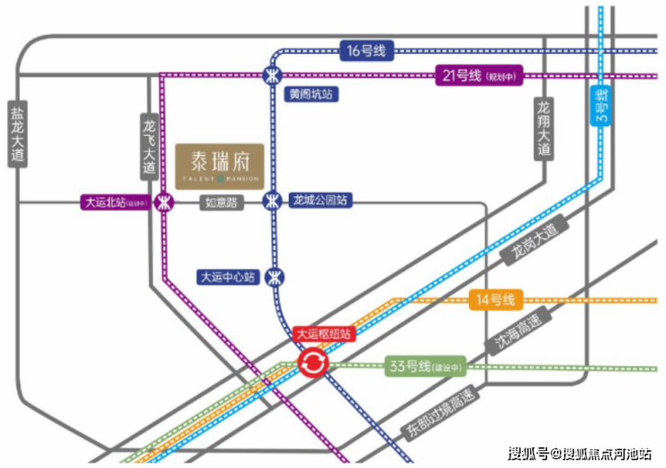 其中,大运枢纽作为东部唯一集城际、快线、普线于一体的交通枢纽,有3/14/16及33(在建中)号线交汇,未来可高效畅达深圳各区,并链接湾区各地。