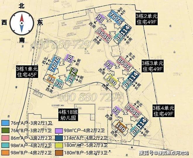 楼栋:4栋45-49层住宅(3栋1单元45F,3栋2/3/4单元49F)、1栋18班幼儿园