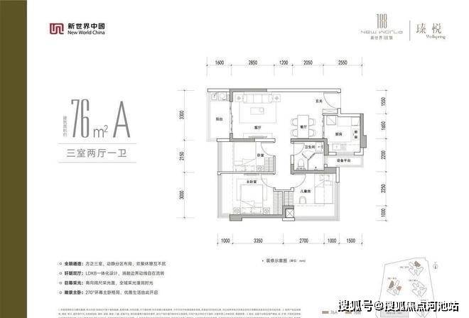 76㎡A户型:3房2厅1卫经典竖厅设计,客厅开间3.3米,LDKB一体化,连接景观阳台,通风采光俱佳,三间卧室布局合理,动静分区,U型厨房设计,操作动线流畅,卫生间干湿分离设计,提升使用效率,主卧270°无柱转角飘窗,拥有更大的景观面,三栋一单元朝西北,三栋二单元朝东北向。