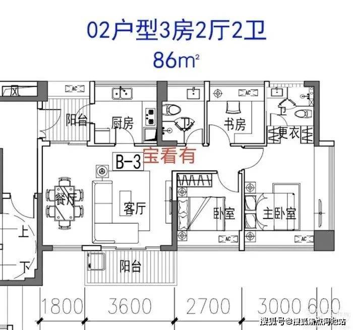 先看约87㎡3房1卫户型。