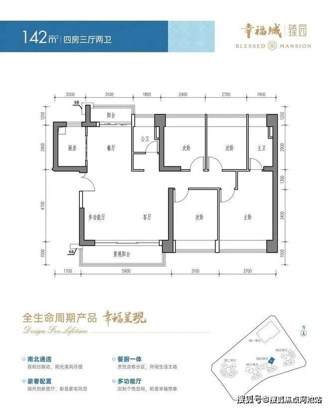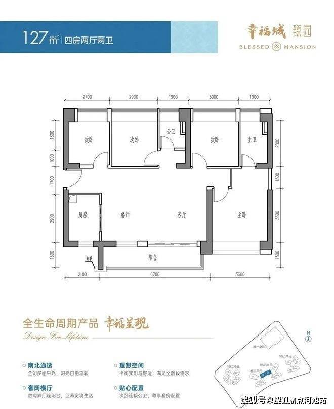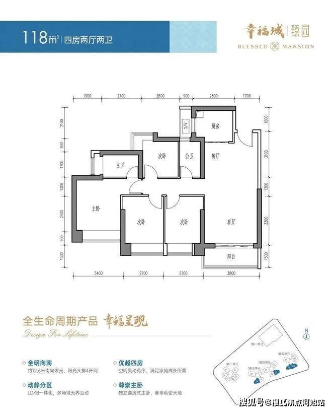 02.建面约114-117㎡四房两厅两卫(横厅),全明四开间朝南,客厅开间4.4米,6.3米南向舒阔双厅,东南或西南朝向。