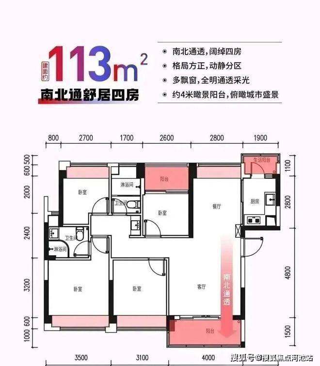3、户型:建筑面积约113-120㎡四房两厅两卫,稀缺南北通透,三阳台设计,约4米阔景大阳台