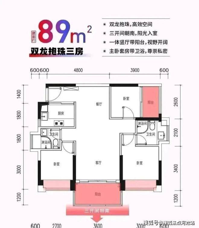 2、户型:建筑面积约89㎡三房两厅两卫,东南朝向,双阳台,主卧套房设计
