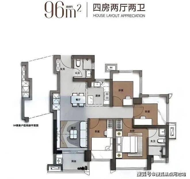 96㎡的4房2厅2卫,设计的是竖厅格局,得房率约100%(包含赠送),西南朝向。