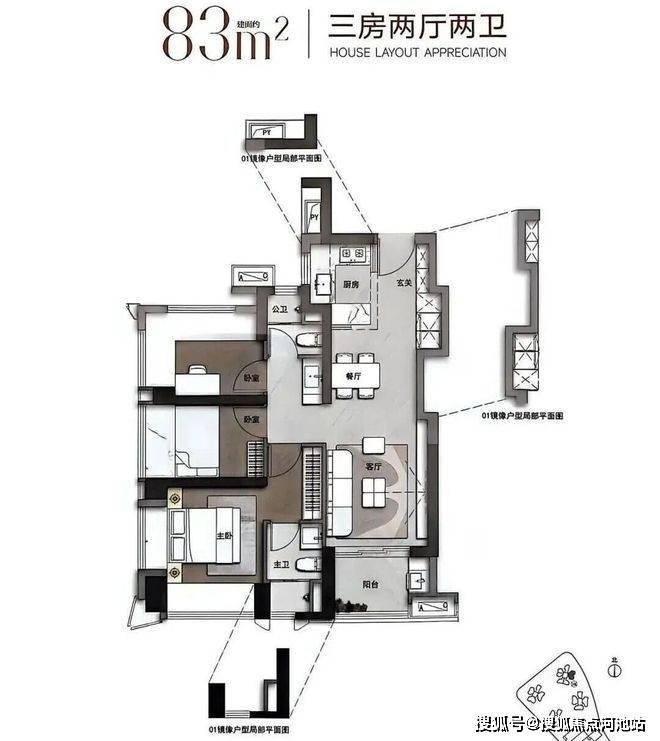 83㎡的3房2厅2卫,设计的是竖厅格局,得房率约100%(包含赠送),东南朝向。