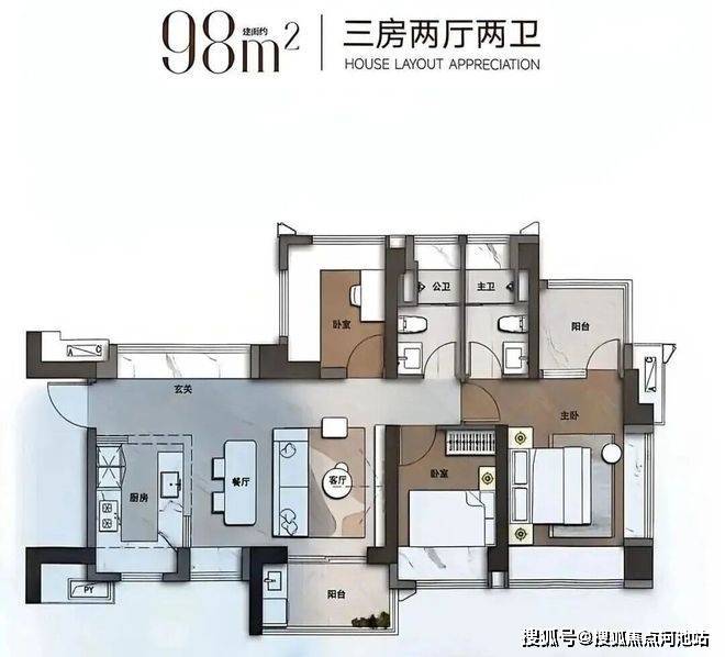 98㎡的3房2厅2卫,可以改4房的户型,得房率约100%(包含赠送),东南朝向。