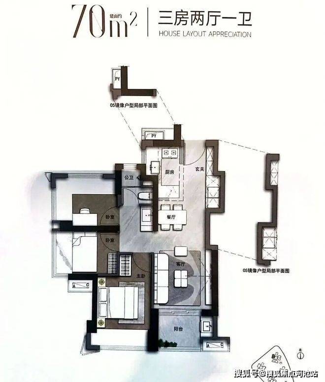 70㎡的3房2厅1卫,设计的是竖厅格局,得房率约100%(包含赠送),西北朝向。