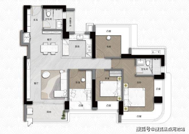 105㎡3+1 房两厅两卫:弹性方厅设计,可增设书房或儿童活动区;多飘窗拓展空间,兼顾功能性与性价比,适合首次改善。