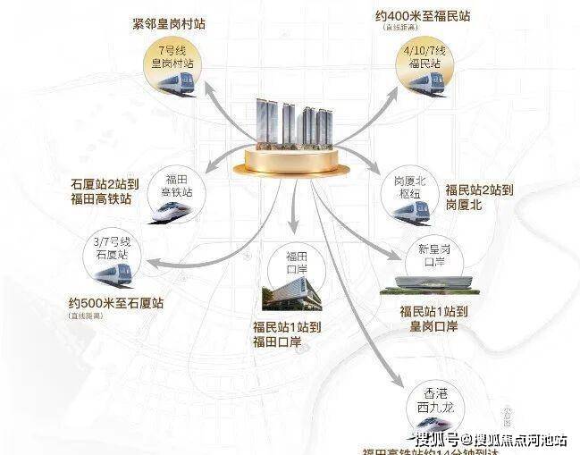 地铁:7 号线皇岗村站无缝接驳社区负一层,步行约 3 分钟可达;300 米内覆盖 4/10 号线福民站,500 米至 3 号线石厦站,四线交汇,2 站到皇岗 / 福田口岸,2 站达福田高铁站,3 站到岗厦北枢纽。