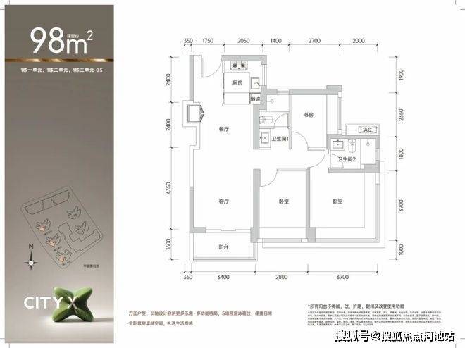 98㎡的3房2厅2卫,1栋1/2/3单元03.05户型,设计的是经典竖厅格局,进门入户玄关,客厅3.4米开间,LDKB一体化,S墙设计预留冰箱卡槽位,三开间朝南,动静分区,3个卧室分别做到了主卧14.3㎡/次卧10.36㎡/次卧6.75㎡(包含墙体飘窗),U型厨房,公卫三段式分离,得房率约90%(包含赠送),东南或西南朝向。