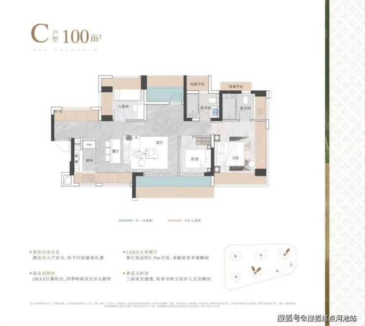 实际使用率(含赠送)在95%左右,相比建筑老规设计,得房率高了10%。79㎡就能做到三房二卫,89㎡能做到四房二卫,99-119㎡四房二卫。