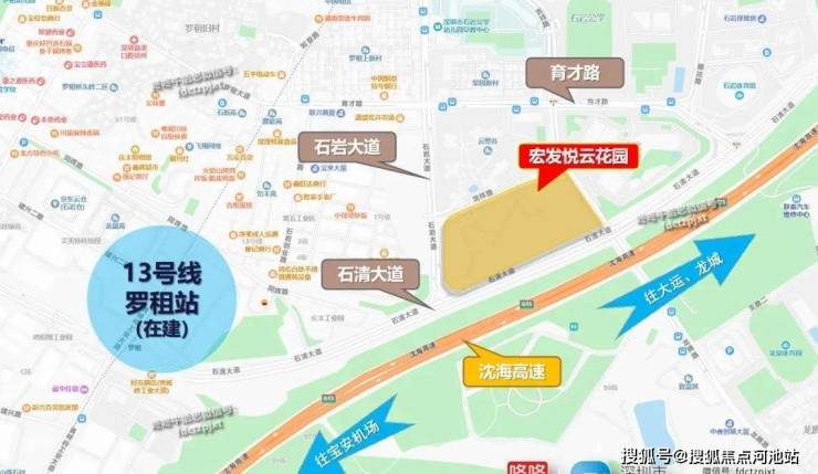 宝安区石岩大道与石清大道交汇处的东侧,南侧临近沈海高速,在建的13号线罗租站位于项目西侧的道路尽头。