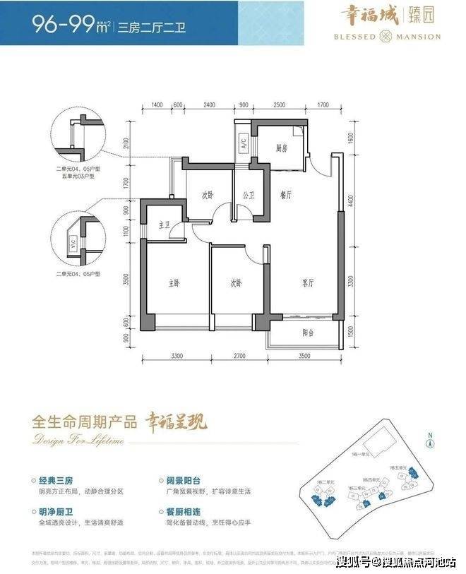 96-99㎡的3房2厅2卫,设计的是经典竖厅格局,客厅3.5米开间,LDKB一体化设计,动静分区,3个卧室分别做到了主卧14.63㎡/次卧11.07㎡/次卧7.26㎡(包含墙体飘窗),U型厨房,卫生间干湿分离,得房率约81-84%(包含赠送),东南/西南或东北朝向。