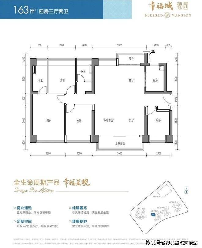 163㎡的4房3厅2卫,设计的是横厅南北通透格局,进门入户玄关,客厅5.9米开间,餐厨一体化设计,南北双阳台,全屋7个飘窗面,4个卧室分别做到了主卧20.14㎡/次卧12㎡/次卧11.47㎡/次卧10.43㎡(包含墙体飘窗),客厅出5.9米长的观景大阳台,U型厨房,公卫三段式分离,得房率约88.25%(包含赠送),阳台主朝西南向。
