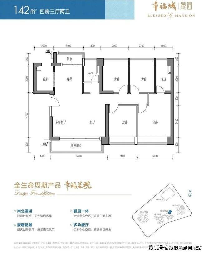 142㎡的4房3厅2卫,设计的是横厅南北通透格局,进门入户玄关,客厅5.9米开间,餐厨一体化设计,南北双阳台,全屋6个飘窗面,4个卧室分别做到了主卧18.31㎡/次卧12.4㎡/次卧10.15㎡/次卧9.45㎡(包含墙体飘窗),客厅出5.9米长的观景大阳台,U型厨房,公卫三段式分离,得房率约87.1%(包含赠送),阳台主朝东南向。