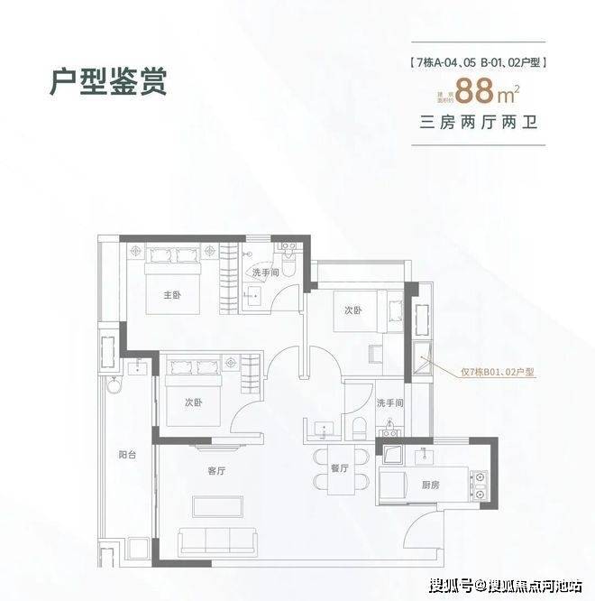 88㎡的3房2厅2卫,设计的是经典竖厅格局,进门入户玄关,LDKB一体化设计,动静分区,客厅连接次卧出大阳台,L型厨房,公卫三段式分离,得房率约82%(不含赠送),西南或东北朝向。