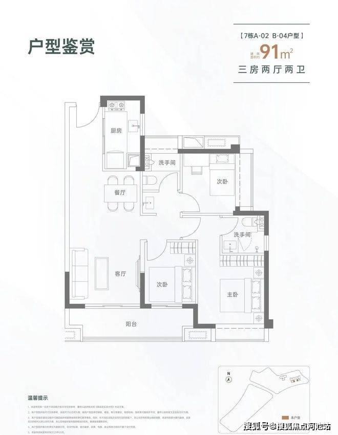 91㎡的3房2厅2卫,设计的是经典竖厅格局,进门入户玄关,LDKB一体化设计,三开间朝南,动静分区,客厅连接次卧出大阳台,L型厨房,公卫三段式分离,得房率约82%(不含赠送),东南朝向。
