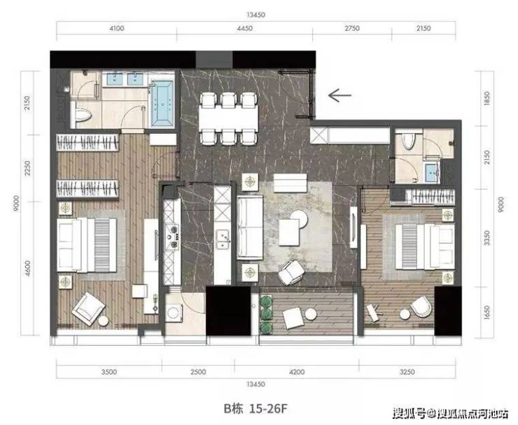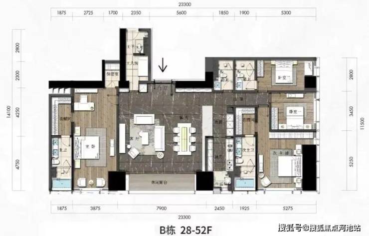 所有340㎡户型位于B栋28-52F正东朝向,23米观海面,向海而生,无言的霸气。