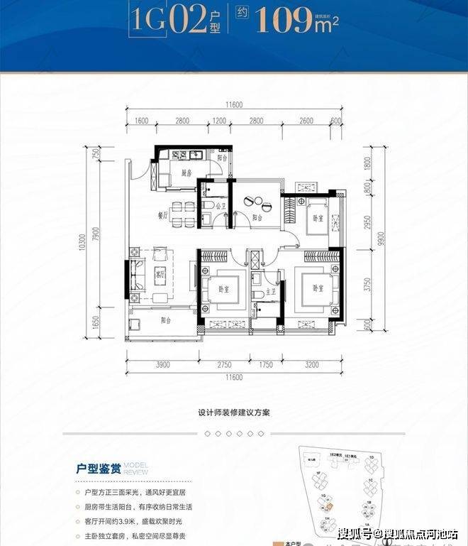 109平4房2卫,竖厅格局,南北通透/东南朝向,赠送面积14.41-16.43㎡,加赠送后得房率约92.82-94.67%。