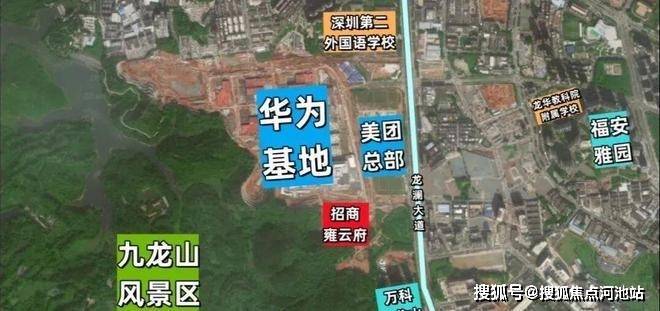 招商雍云府,位于龙华区福城街道九龙山社区龙澜大道旁,项目西侧紧挨大水坑社区公园;北侧是九龙山智能科技城,华为新基地+美团总部均集结于此;南侧靠近万科九龙山,西侧一大片区域是福城土地整备利益统筹项目,最近的4号地铁线“长湖站”距离约2.8公里。