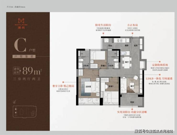 89㎡的3房2厅2卫,A户型(1栋1单元06户型),设计的是经典竖厅格局,进门入户玄关,LDKB一体化,S墙设计预留冰箱卡槽位,三开间朝南,动静分区,主卧双面大飘窗,客厅连接次卧出5.6米长的观景阳台,U型厨房,公卫三段式分离,东南朝向。