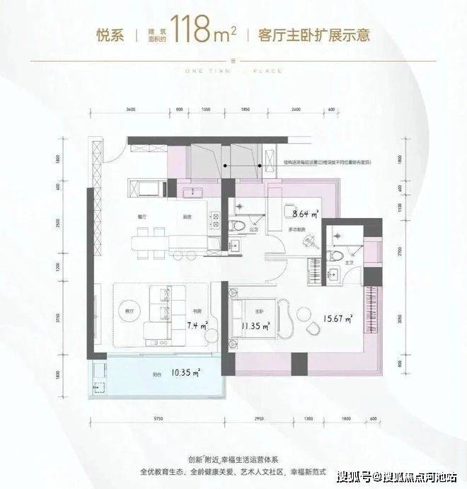 118㎡的4房2厅2卫,1栋2单元02户型,设计的是竖厅格局,进门约6.12平的入户玄关位,客厅3.5米开间,LDKB一体化设计,四开间朝南,动静分区,分别做到了主卧15.67㎡/次卧11.35㎡/次卧8.46㎡/次卧7.4㎡(包含墙体飘窗),客厅连接次卧出5.75米长的大阳台约10.35平,U型厨房,公卫三段式干湿分离,得房率约96.5%(包含赠送),东南朝向。这个户型区别之处在于公卫,卧室,飘窗赠送面积14.31㎡+阳台赠送面积5.17㎡=实际赠送19.48㎡。