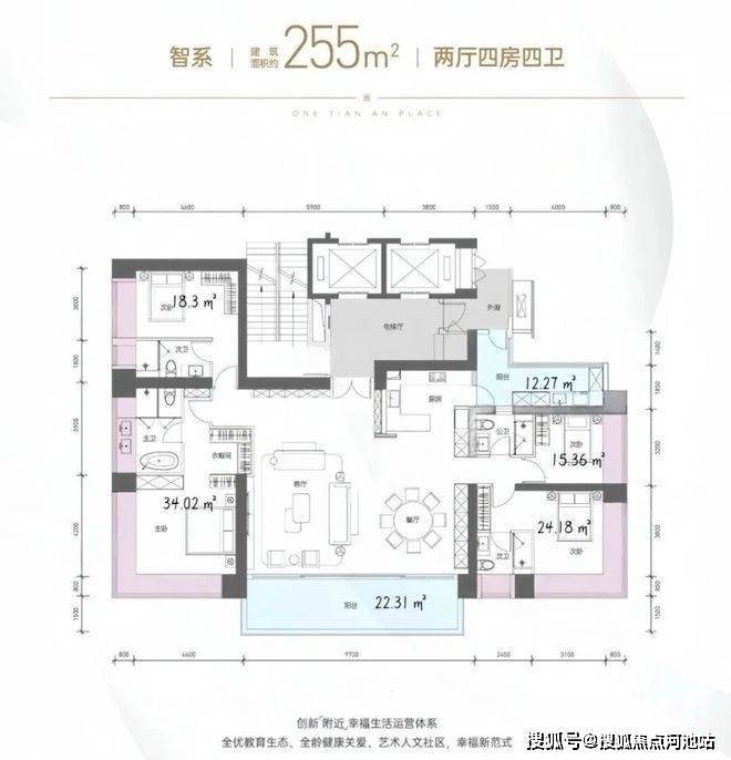 255㎡的4房2厅4卫,1栋1单元01/02户型,设计的是竖厅双龙抱珠格局,专梯入户送超大私用入户空间,客厅9.7米开间,LDKB一体化设计,主卧带大衣帽间,三套房设计,分别做到了主卧34.02㎡/次卧24.18㎡/次卧18.3㎡/次卧15.16㎡(包含墙体飘窗),客厅连接餐厅出9.7米长的大阳台约22.31平,J型厨房带1个生活阳台约12.27平,卫生间干湿分离,得房率约96.7%(包含赠送,不含入户空间),西南或东北朝向。飘窗赠送面积24.8㎡+阳台赠送17.29㎡=实际赠送42.09㎡(不含电梯入户空间)。
