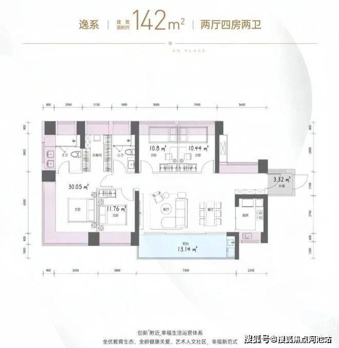142㎡的4房2厅2卫,1栋2单元05户型/2栋1单元01户型,设计的是横厅南北通透格局,独门独户,赠送约3.32平的入户空间,客餐厅7.3米开间,LDKB一体化设计,五开间朝南,主卧带大衣帽间,分别做到了主卧30.05㎡/次卧11.76㎡/次卧10.8㎡/次卧10.44㎡(包含墙体飘窗),客厅连接餐厅出7.3米长的大阳台约13.14平,U型厨房,卫生间干湿分离,得房率约103.95%(包含赠送),西南或东南朝向。飘窗赠送面积24.12㎡+阳台赠送6.57㎡+外廊赠送3.32㎡=实际赠送34.01㎡。