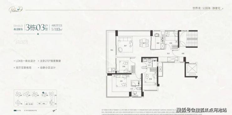 从效果图来看,户户都拥有约6-8m长阳台,主卧位拥有270°的转角飘窗。