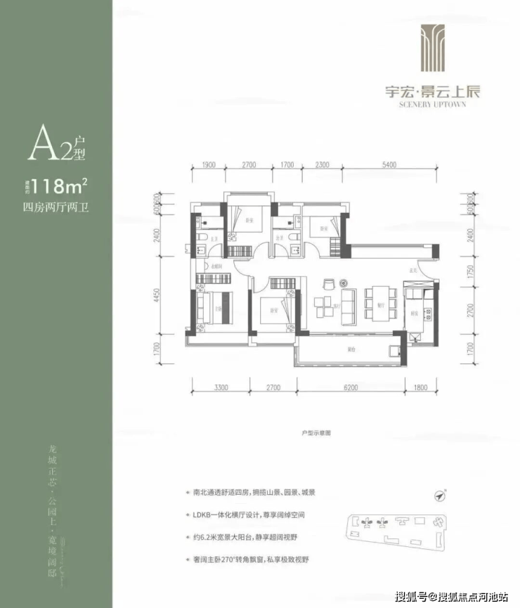 118㎡的4房2厅2卫,设计的是横厅南北通透格局,客餐厅6.2米开间,LDKB一体化,五开间朝南,西北面5.4米长的观景大飘窗,4个卧室分别做到了3.3米/2.7米/2.7米/2.3米的宽度,客厅连接餐厅位出6.2米长的大阳台,L型厨房,卫生间干湿分离,得房率约76%(不含赠送),东南朝向。