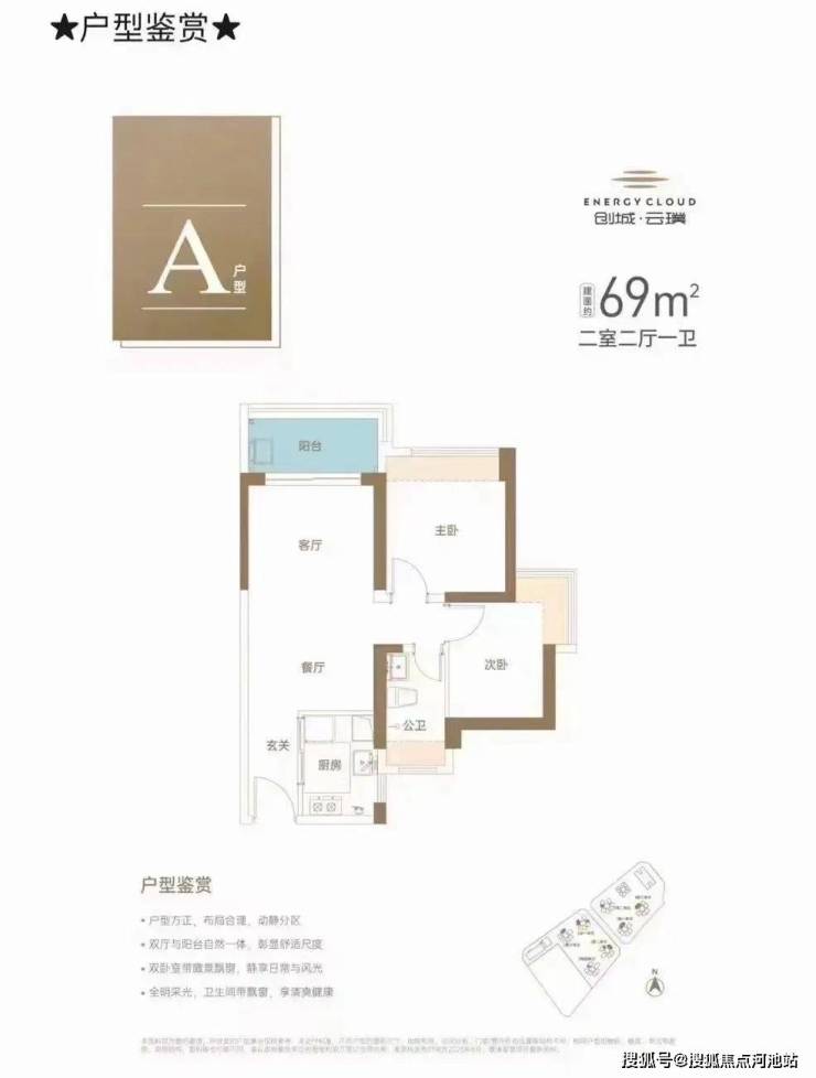 69㎡的2房2厅1卫,设计的竖厅格局,有西北向、东向、东北朝向。