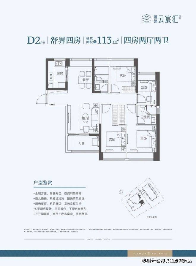 113㎡的4房2厅2卫,设计的是竖厅南北通透格局,客厅3.4米开间,LDKB一体化,三开间朝南,U型厨房,得房率:75.2%(不含赠送),客厅阳台东南朝向。