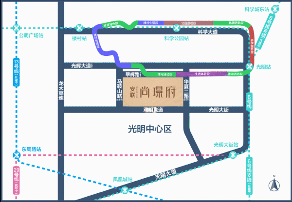 地铁13号线(在建中)、18号线(规划)、29号线(规划)等轨道交通将促进光明区更快接轨湾区