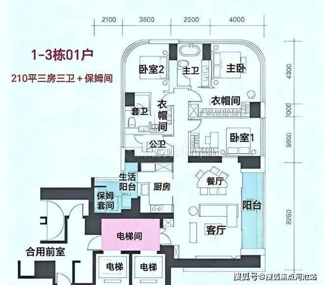 每户都是专梯入户+入户空间。C栋位于小区最里面,东南向户型(218㎡01)会被A、B栋遮挡。