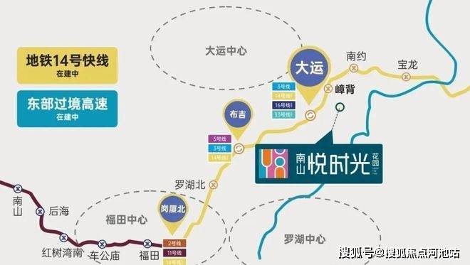 14号地铁线“南约站”距离约2公里,2站到大运,7站到布吉,8站到罗湖,10站到福田岗厦北35分钟。