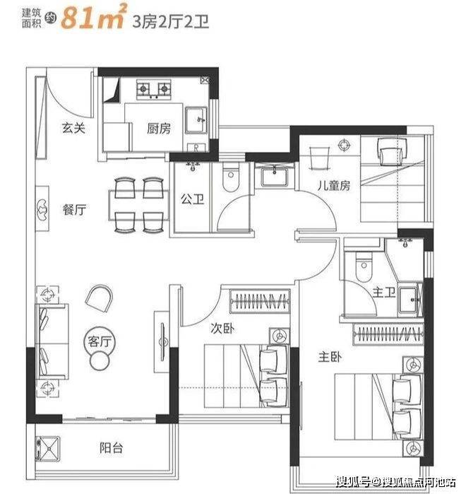 3、户型设计合理:主打71-81㎡三房户型,空间利用率高,71㎡户型卫生间采用3分离设计,81㎡户型主卧带独立卫生间。