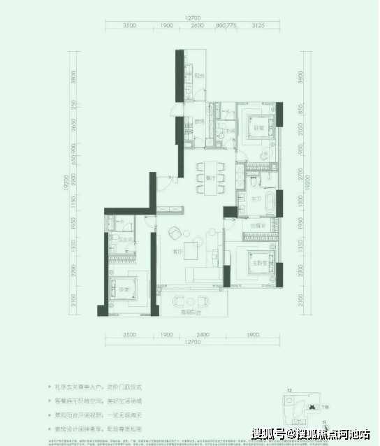 T1A栋F户型格局感觉是T1A栋D户型的削弱版,尺度更小,东西向面宽缩短,减少了一个房间。相同的景观面,但该户型楼层更高。不足之处在于,“中央公卫”设计很突兀,狭长的过道有点浪费面积。