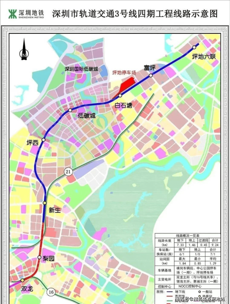 3号东延线“坪西站”距离约1.1公里,“新生站”距离约1.3公里,深惠城际“坪地站”距离约2.3公里,可以乘坐3号东延线1站到国际低碳城,再换乘坪地站。