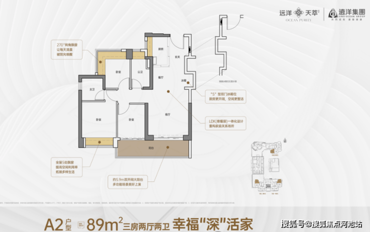 89㎡的3房2厅2卫A2户型:是竖厅设计。客厅开间3.5米,LDKB一体化(客厅、餐厅、厨房、阳台连通 ),还有S墙,专门留了放冰箱的卡槽位,活动区和休息区分开。次卧是270度转角飘窗。三个卧室实际面积(去掉墙后):主卧约12.54㎡,次卧一个约7.24㎡ ,另一个约6.08㎡。客厅连着次卧,出5.9米长的大阳台。厨房是U型的,卫生间干湿分开。不算赠送,得房率大概72.16 - 72.57% ,朝向是正西、正东或者正南。套内面积64.89㎡,加上赠送的10.68㎡,实际能用到75.57㎡,算上赠送后得房率约84.53% 。