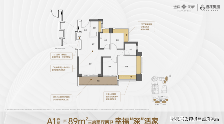 89㎡的3房2厅2卫A1户型:只有1栋1单元、2单元的02户型,还有1栋5单元的05户型才有。是竖厅的布局,客厅开间3.5米,客厅、餐厅、厨房、阳台打通成一体(LDKB一体化 ),有S形的墙,提前留好了放冰箱的卡槽位置,活动和休息的地方分开。三个卧室实际面积(不算墙):主卧12.54㎡,一个次卧7.24㎡ ,另一个次卧6.08㎡。客厅连着次卧,有个5.9米长的大阳台。主卧是两面飘窗,厨房是U型的,卫生间干的湿的地方分开。不算赠送的话,得房率大概71.16 - 72.57% ,朝向是正西、正东或者正南。套内面积64.89㎡,加上送的10.68㎡,实际能用到75.57㎡,算上赠送后得房率大概84.53%