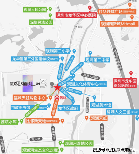 包括观澜体育中心、观湖文化艺术体育场馆(重建中)、观湖美术馆、福城图书馆、龙华区中心医院、龙华人文三馆(建设中)、平安龙华医院(建设中)、深圳民法公园等包含20多个公园、4大人文馆及众多自然、人文历史景点。