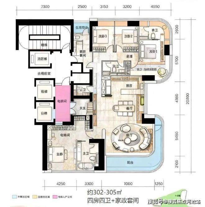 分布:D座和E座,3梯2户,专梯入户,弓形结构,家政套间与采光面设计为亮点,但弧形阳台尺度感一般。