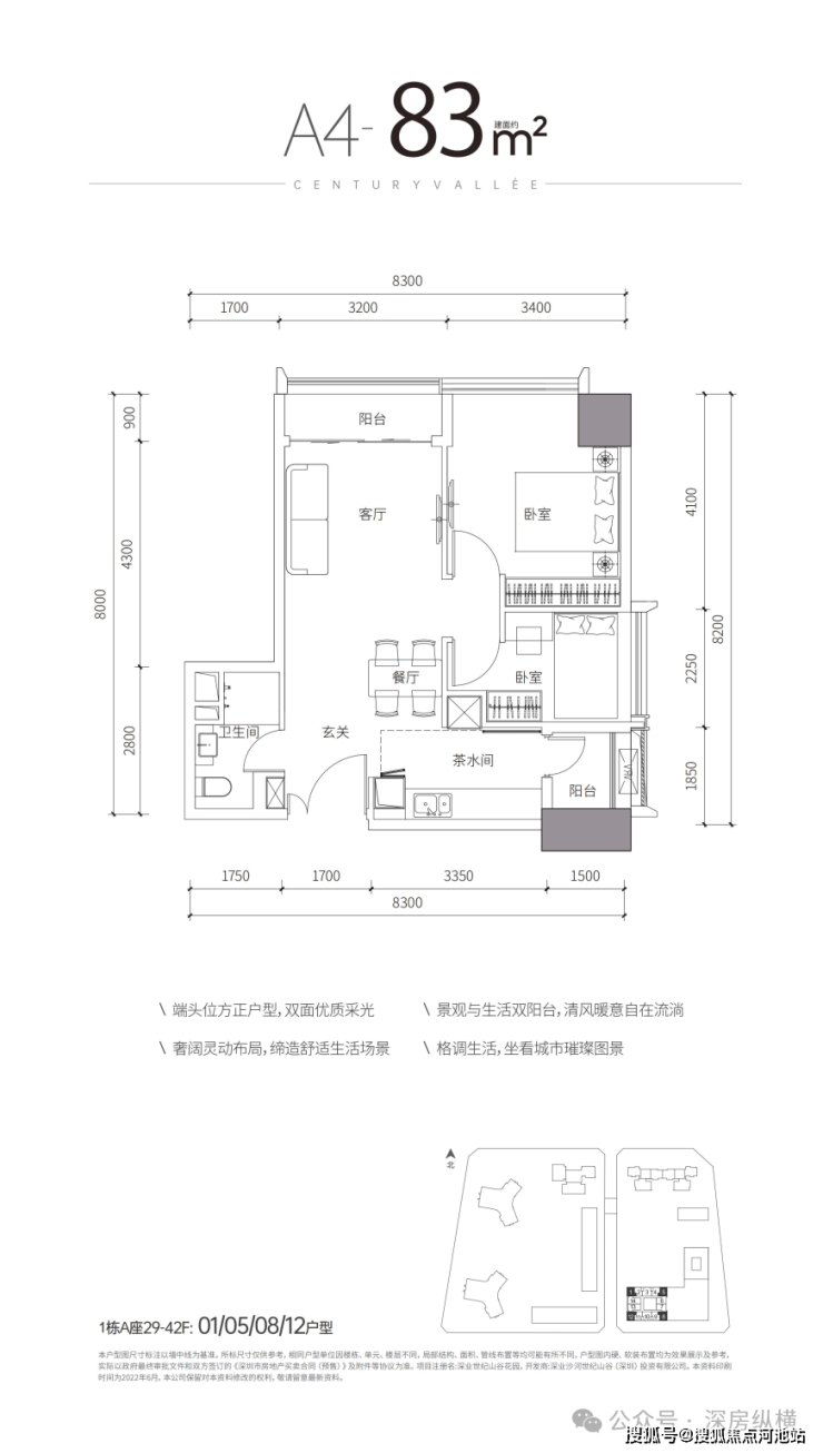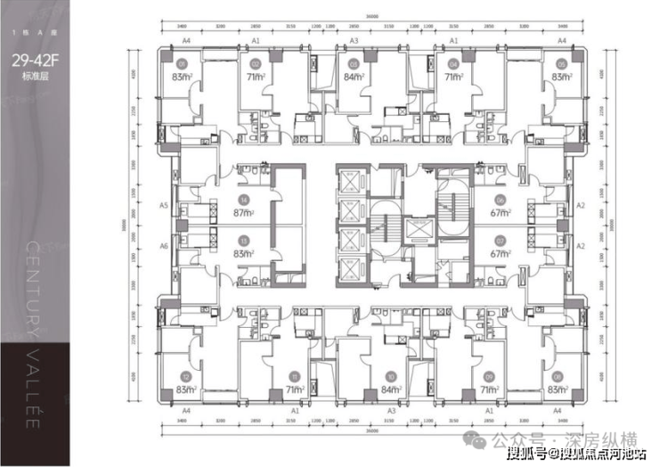 面积为67-71㎡1房卫,83-87㎡2房1卫,位于29-42F,5梯14户。